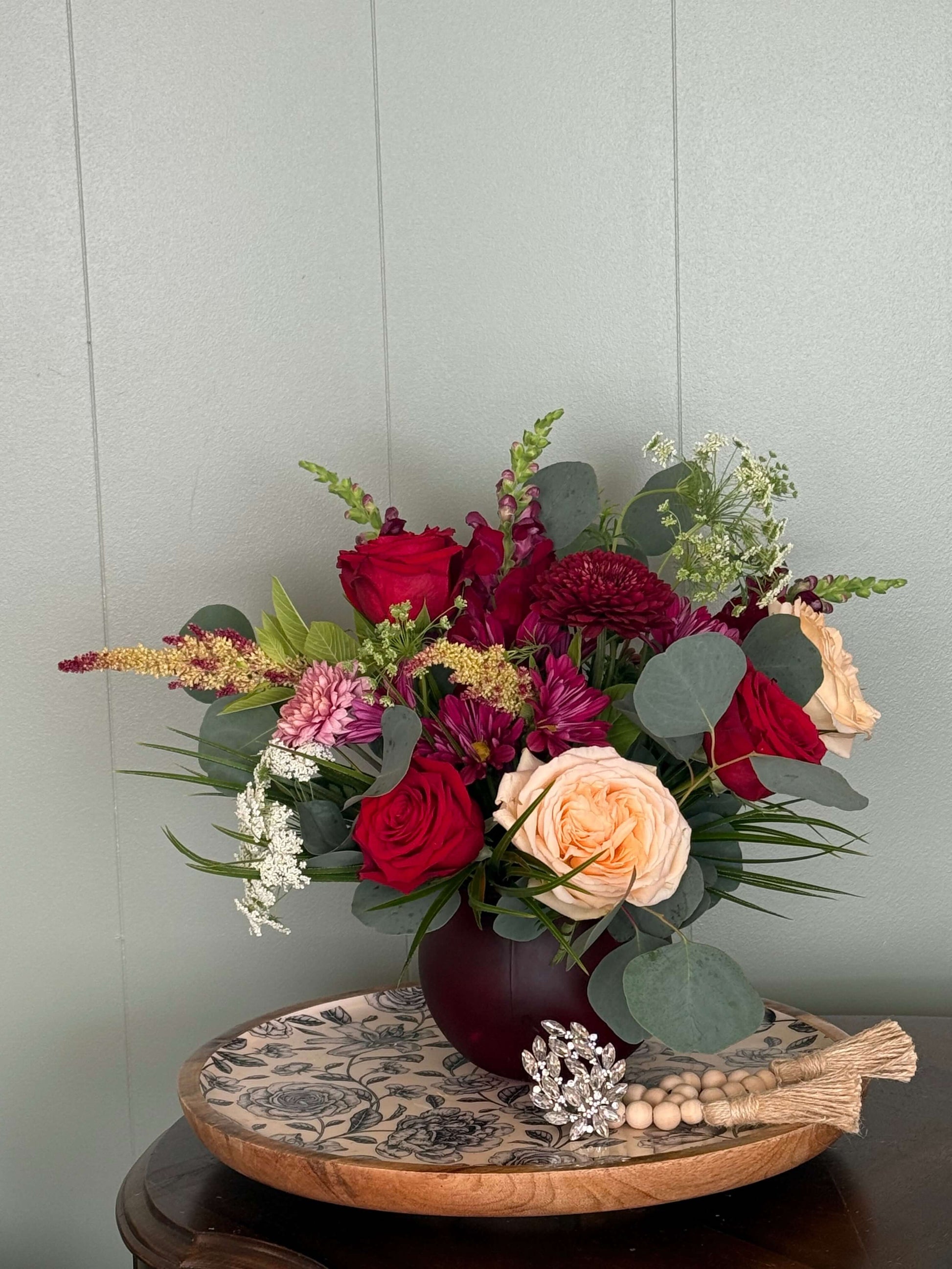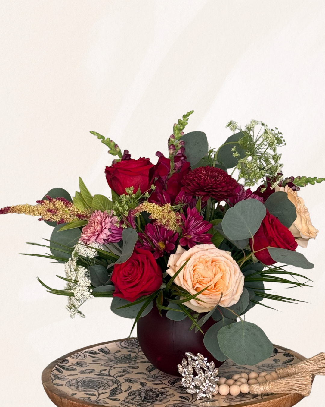 A rich, romantic statement piece full of bold seasonal beauty. Featuring velvety burgundy dahlias, snapdragons, peach garden roses, and wisps of eucalyptus, this floral arrangement evokes the warmth of a golden hour garden. Designed in a low, lush silhouette, it's perfect for a coffee table, entryway, or center of celebration. Why You’ll Love It: Artistic, garden-style design with premium seasonal blooms Designed for luxury floral gifting or statement decor Perfect for birthdays, thank-you, or “just because” moments.
