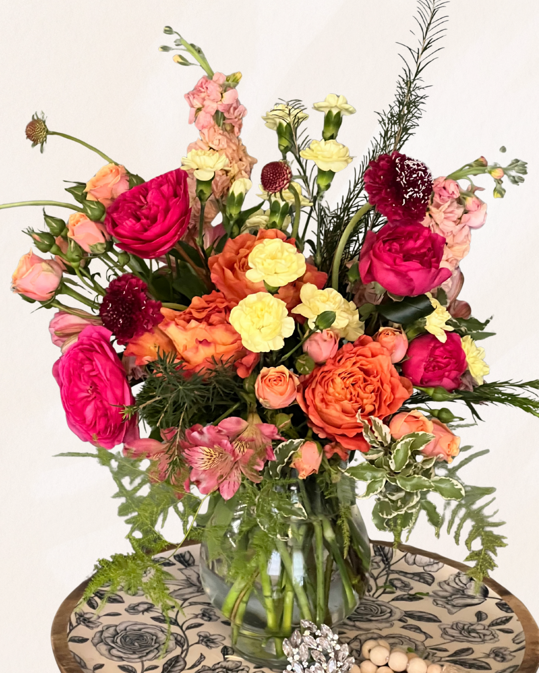 Vibrant and joyful, this bold arrangement features hot pink, tangerine, and lemon-hued blooms. A celebration in a vase, designed to bring color and cheer wherever it goes. Perfect For: Birthday, Celebration, Congratulations, Thank You
