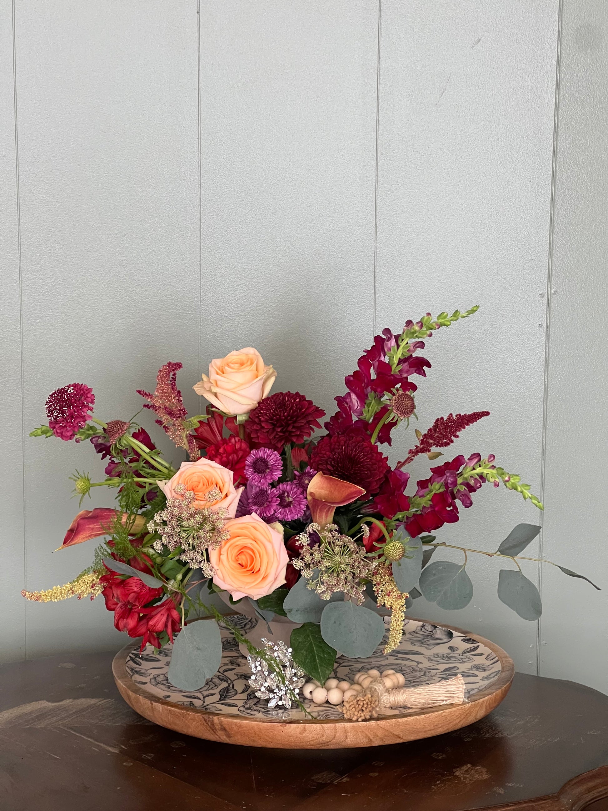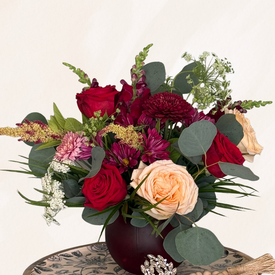 Bold, lush, and beautifully moody — this designer arrangement features rich red roses, burgundy mums, creamy peach garden roses, and soft accents of eucalyptus and seasonal texture. Handcrafted in a matte merlot vase, this piece radiates warmth and elegance with a dramatic edge. It’s a perfect statement for love, remembrance, or simply celebrating life’s beauty with bold florals