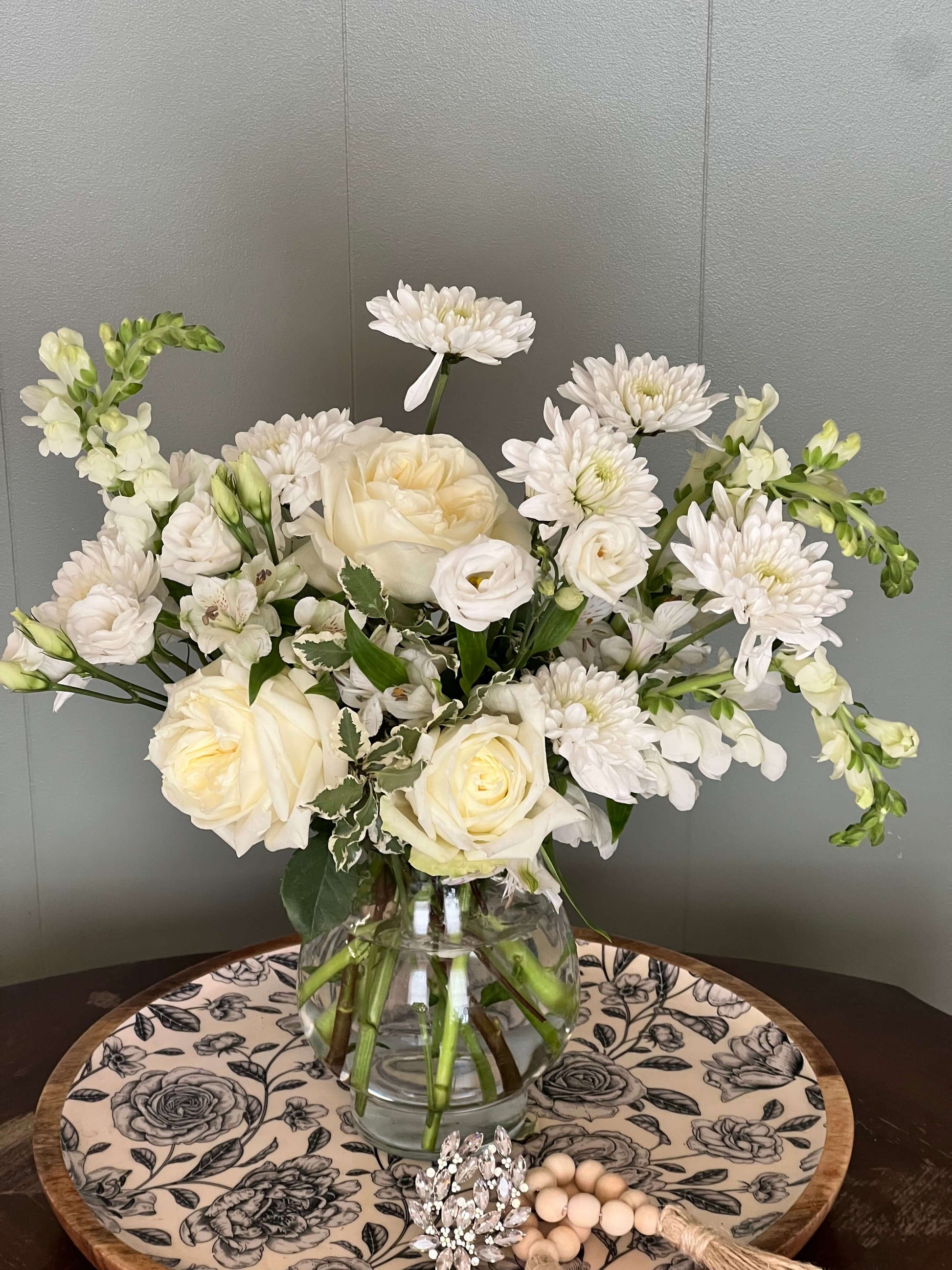 A timeless arrangement of creamy white roses, snapdragons, and seasonal blooms designed in a clear glass vase. This elegant bouquet is perfect for sending sympathy, grace, or simply expressing quiet beauty. Perfect For: Sympathy, Thinking of You, Everyday Elegance