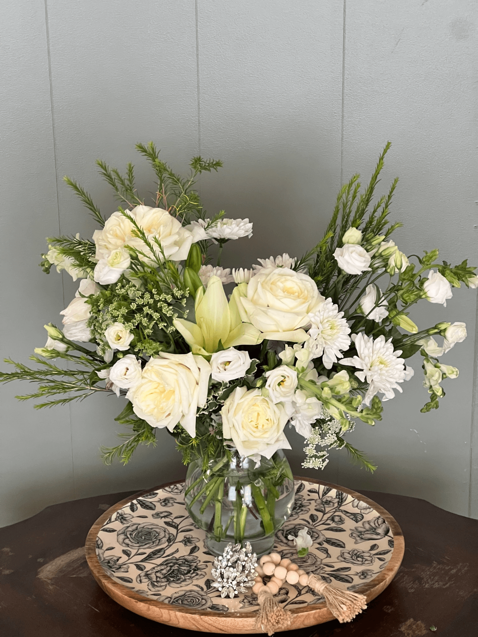 Soft and serene, this garden-style design features ivory roses, lilies, delicate lisianthus, and flowing greenery. A peaceful, elegant choice to honor life’s most meaningful moments. Perfect For: Sympathy, Funeral, Memorial, Wedding Welcome Table